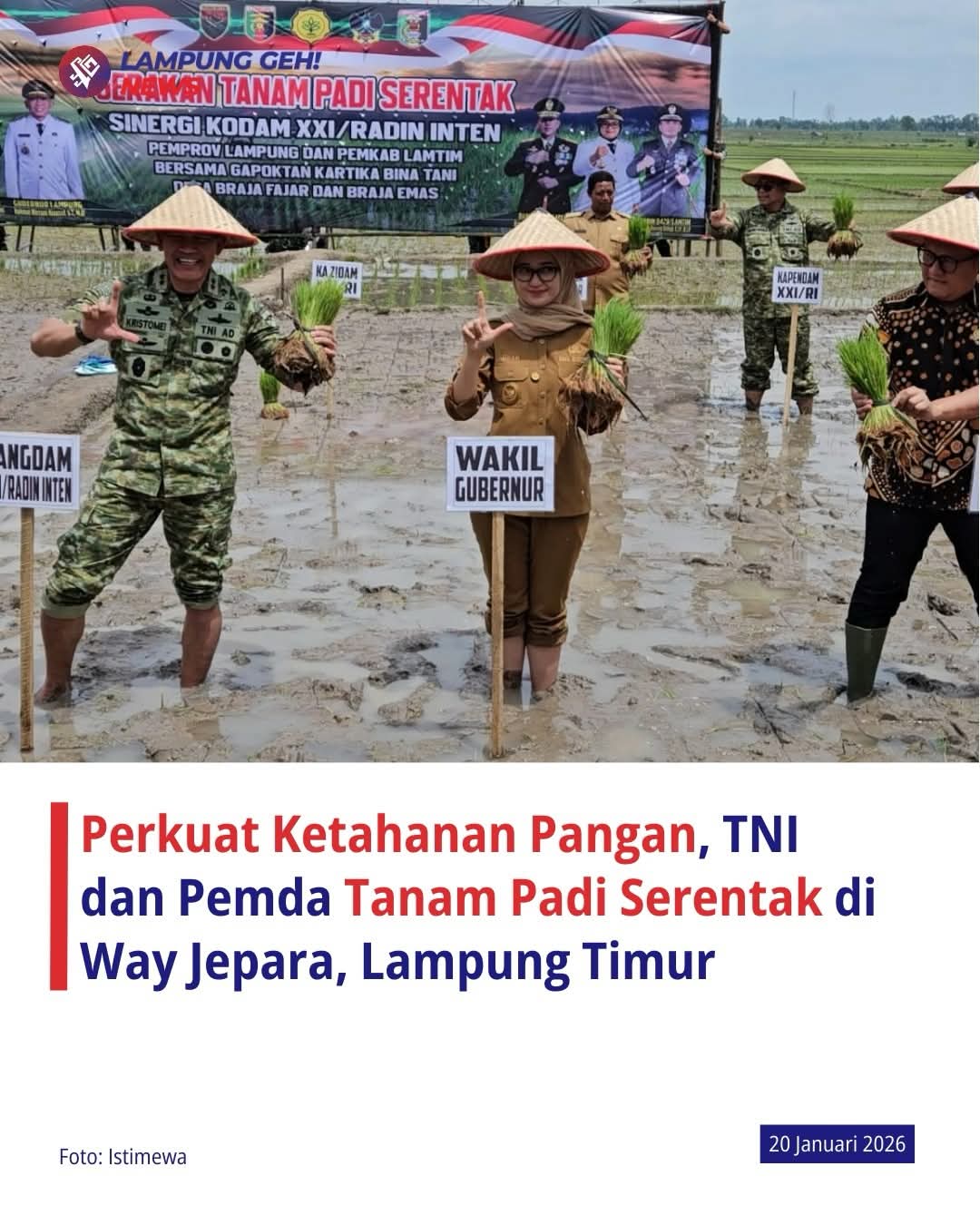Pemerintah Kabupaten Lampung Timur bersama Kodam XXI/Radin Inten dan Pemerintah Provinsi Lampung menggelar Gerakan Tanam Padi Serentak sebagai wujud nyata sinergi lintas sektor dalam memperkuat ketahanan pangan nasional. Kegiatan ini dilaksanakan bersama Gapoktan Kartika Bina Tani di Desa Braja Fajar dan Braja Emas, Kecamatan Way Jepara, Selasa (20/01/2026).