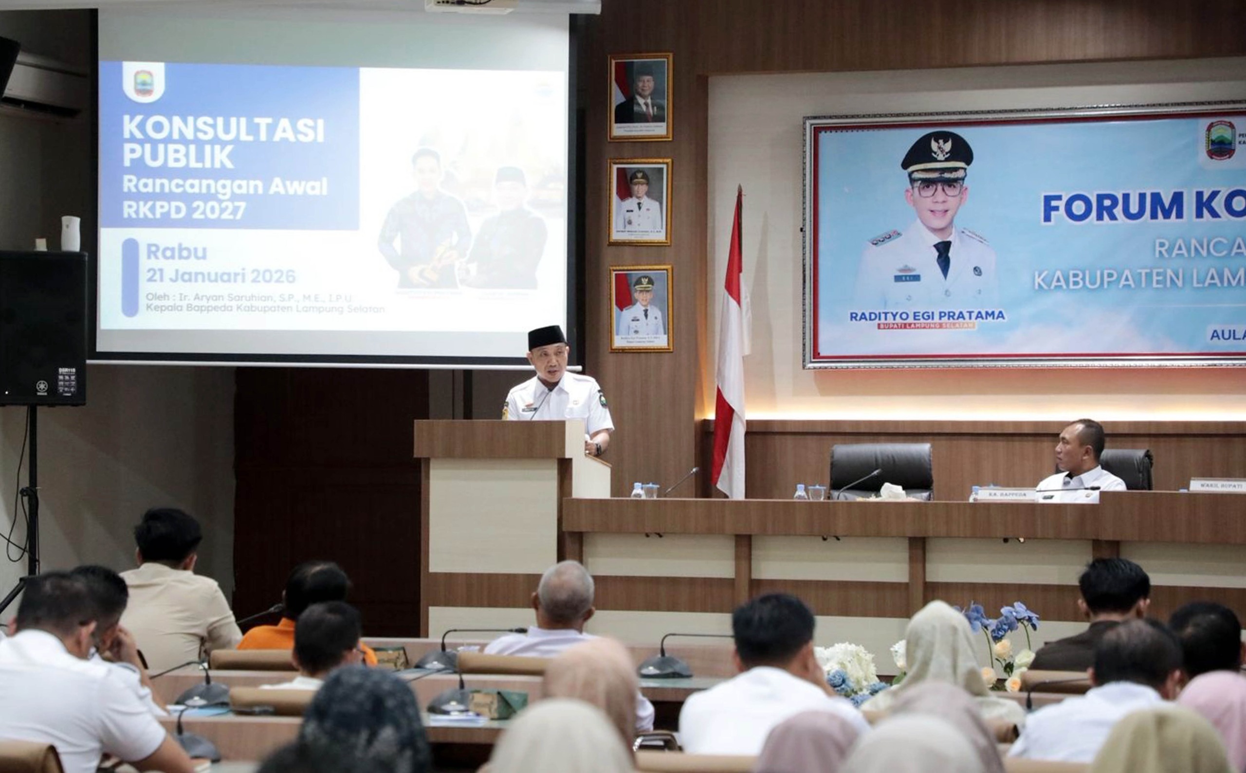 Pemerintah Kabupaten (Pemkab) Lampung Selatan menggelar Konsultasi Publik Rancangan Awal Rencana Kerja Pemerintah Daerah (RKPD) Kabupaten Lampung Selatan Tahun 2027 sebagai tahapan awal dalam proses penyusunan dokumen perencanaan pembangunan daerah.