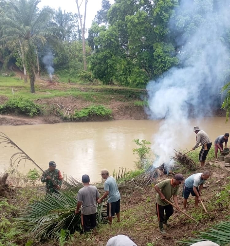 Terlihat Minggu, (5/4/2026) di Desa Trisinar, Babinsa bersama warga setempat melakukan gotong royong pembersihan di seputaran lokasi yang akan di bangun jembatan.